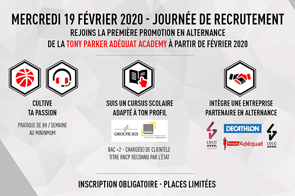 Le mercredi 19 février 2020, la Tony Parker Adéquat Academy organise une journée de recrutement pour le lancement de la première promotion en alternance !